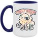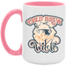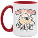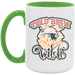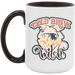 - High quality ceramic mug with two-tone rim, interior, & handle